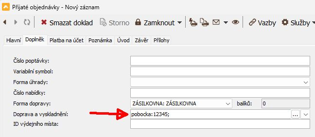 Balíkobot si umí načíst ID pobočky z pole Doprava a vyskladnění. Data tam musí být ve formátu (pozor na povinný středník na konci): pobocka:XYZ;